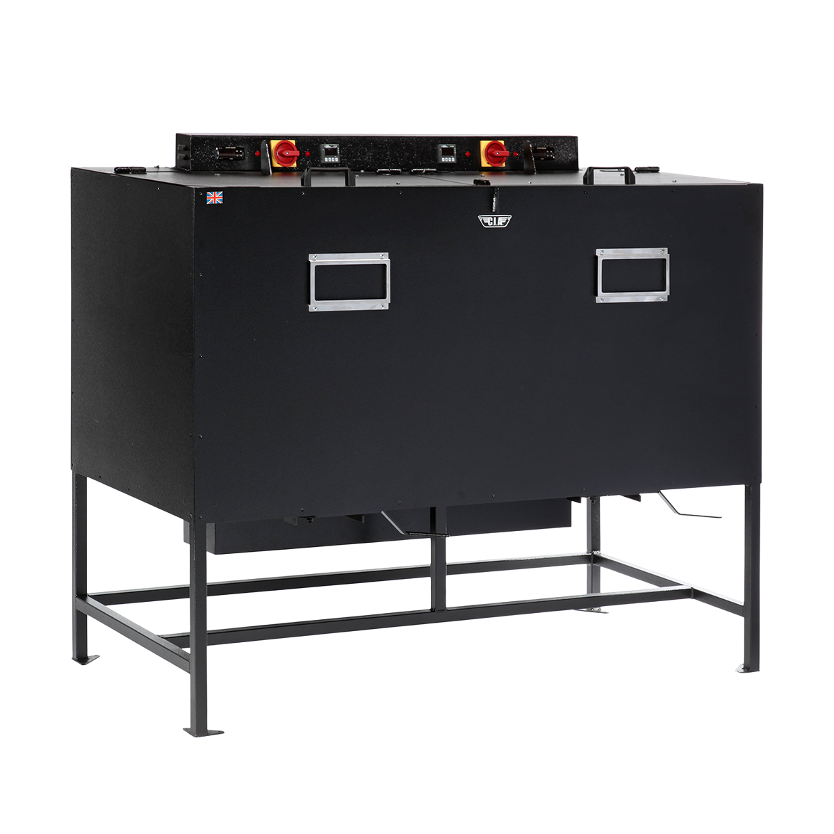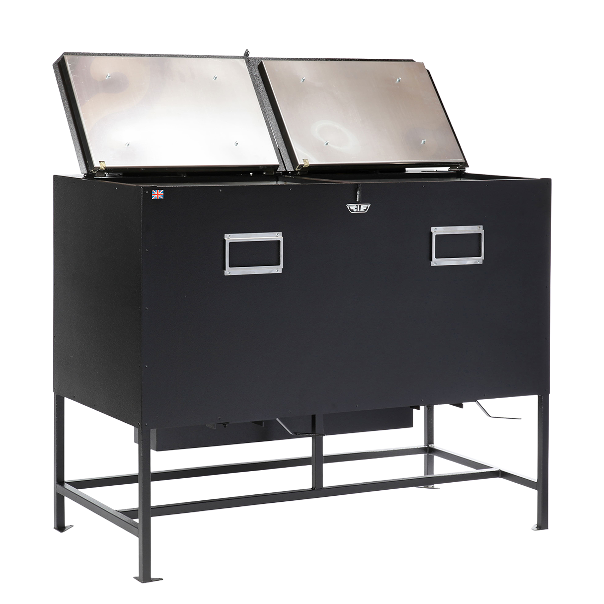 Een fluxoven voor het opslaan en regenereren van lasflux, voorzien van isolatie met hoge dichtheid, digitale regeleenheid met programmeerbare onderhouds- en regeneratie-cyclus voor het gelijktijdig gebruik van twee tanks, waarbij de verwarmingselementen in contact staan met de flux. Compleet met volledig kalibratiecertificaat.