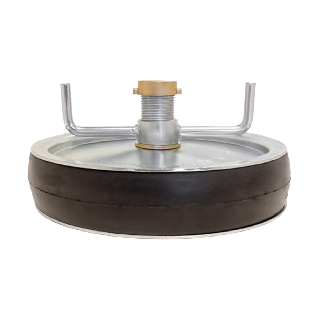Pijpstopper 10” inch met doorlaat, stalen (of aluminium) drukplaten, vleugelmoer en enkele rubberen ring, alle afsluitstoppen met doorlaat worden geleverd met afsluitkap.
